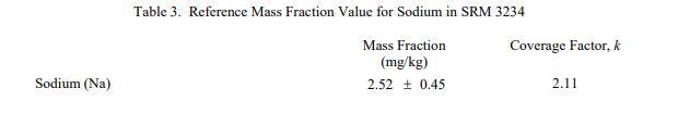 表 3 到表 6 提供了NIST SRM 3234豆粉(標(biāo)準(zhǔn)品) 中鈉、異黃酮、近似物、總膳食纖維、卡路里和氨基酸的參考質(zhì)量分?jǐn)?shù)值,以干質(zhì)量為基礎(chǔ)報(bào)告。NIST 參考值是未經(jīng)認(rèn)證的值,它是基于可用數(shù)據(jù)對(duì)真實(shí)值的最佳估計(jì);但是,該值不符合 NIST 認(rèn)證標(biāo)準(zhǔn) [1],并且提供的不確定度可能僅反映測(cè)量再現(xiàn)性,可能不包括所有不確定性來源,或者可能反映多種分析方法之間缺乏足夠的統(tǒng)計(jì)一致性。參考質(zhì)量分?jǐn)?shù)值來自 NIST 或合作實(shí)驗(yàn)室報(bào)告的結(jié)果。