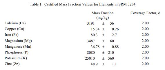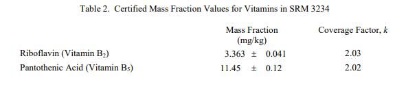 表 1 和表 2 提供了NIST SRM 3234豆粉(標(biāo)準(zhǔn)品) 中元素和維生素的認(rèn)證質(zhì)量分?jǐn)?shù)值,以干質(zhì)量為基礎(chǔ)報(bào)告。NIST 認(rèn)證值是 NIST 對(duì)其準(zhǔn)確性有最高置信度的值因?yàn)樗幸阎蚩梢傻钠妬碓炊家驯徽{(diào)查或考慮 [1]。價(jià)值分配分析由 NIST 和合作實(shí)驗(yàn)室進(jìn)行。認(rèn)證值計(jì)算為 NIST 方法的平均值和合作實(shí)驗(yàn)室提供的平均結(jié)果的中位數(shù)(在適當(dāng)?shù)那闆r下)。所有值在沒有加權(quán)的情況下合并。相關(guān)的不確定性以大約 95% 的置信水平表示 [2-4]。