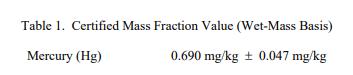 表 1 中提供了汞的認證值,表示為基于濕質量(原樣)的質量分數 [1]。該值基于使用冷蒸氣同位素稀釋的主要方法進行的分析電感耦合等離子體質譜 (CV-ID-ICP-MS) [2,3]。 NIST 認證值是 NIST 對其準確性具有最高置信度的值,因為所有已知或可疑的偏差來源都已被調查或考慮 [4]。認證值的不確定度以擴展不確定度的形式給出,以大約 95% 的置信度覆蓋被測量。擴展的不確定性計算為 U = kuc 其中uc 是與 ISO/JCGM 指南 [5] 一致的組合不確定度,k 是對應于大約 95% 置信度的覆蓋因子 (k = 2)。被測量是表 1 中列出的汞的總質量分數。計量可溯源至 SI 派生的質量分數單位(以毫克每千克表示)