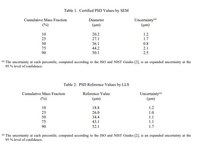 經(jīng) SEM 認(rèn)證的 PSD 值列于表 1。這些認(rèn)證值是通過測量來自三個瓶子的 11 000 多個單個顆粒而確定的。 NIST 認(rèn)證值是 NIST 對其準(zhǔn)確性具有最高置信度的值,因為所有已知或可疑的偏差來源都已被調(diào)查或考慮在內(nèi) [1]。