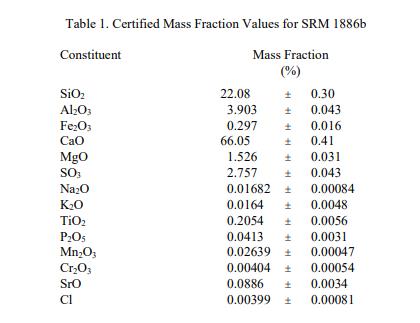 SRM 1886b 成分的認證值在表 1 中報告為收到時的質量分數 [1]。 NIST 認證值是 NIST 對其準確性具有最高置信度的值,因為所有已知或可疑的偏差來源都已被調查或考慮在內 [2]。認證值是對真實值的當前最佳估計。